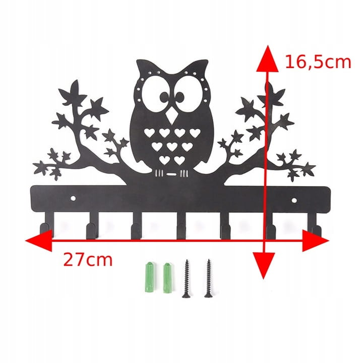 Stylowy wieszak na klucze w kształcie sowy, który doda uroku każdemu wnętrzu. Wykonany z trwałego metalu, zapewnia długotrwałe użytkowanie. Posiada 7 praktycznych haczyków na klucze, umożliwiając wygodne przechowywanie najważniejszych przedmiotów. Wieszak jest łatwy w montażu dzięki otworom montażowym.