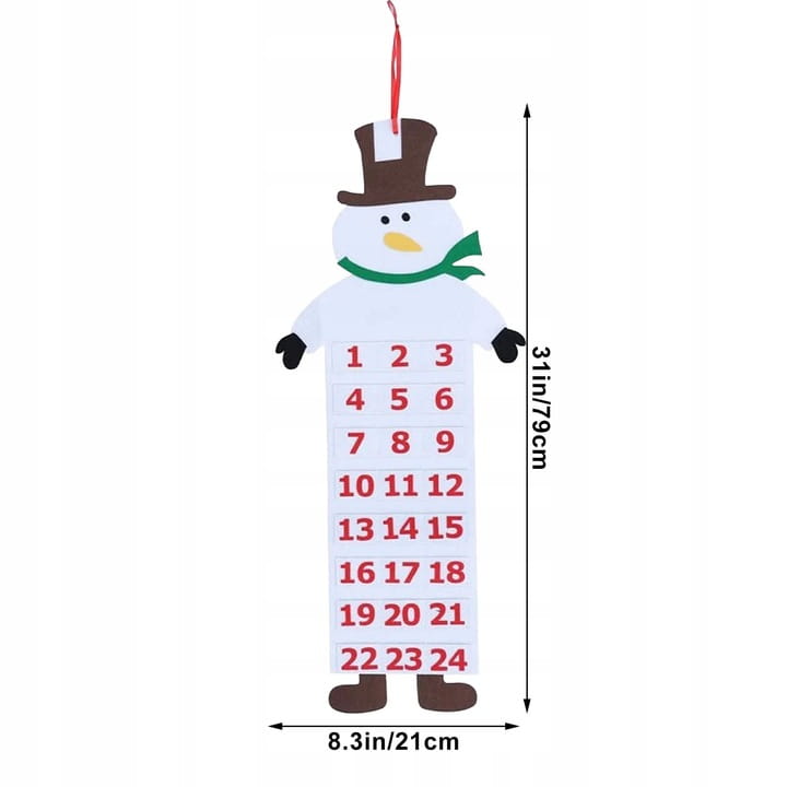 Filcowy kalendarz adwentowy w kształcie wesołego Bałwanka to idealny sposób na odliczanie dni do świąt! Posiada 24 kieszonki, w których możesz umieścić drobne słodycze, liściki lub mini prezenty dla dzieci. Wykonany z miękkiego, przyjemnego w dotyku filcu w żywych, świątecznych kolorach. Zawieszany na sznurku – łatwy do umieszczenia na drzwiach, ścianie lub kominku. Wprowadzi magiczny nastrój w każdym domu i zachwyci najmłodszych każdego poranka!