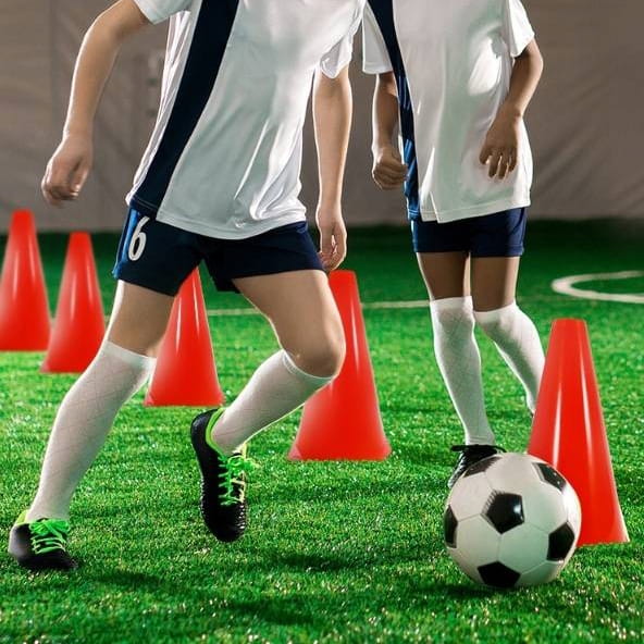✅ Slalom z piłką: Ustaw grzybki w linii prostej, aby zawodnicy mogli driblować piłką między nimi.