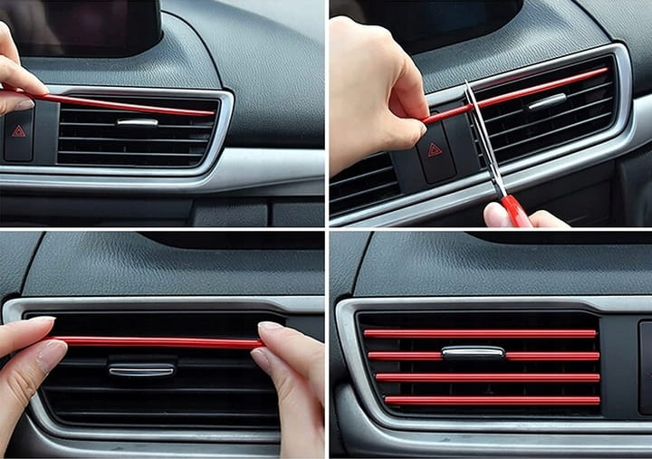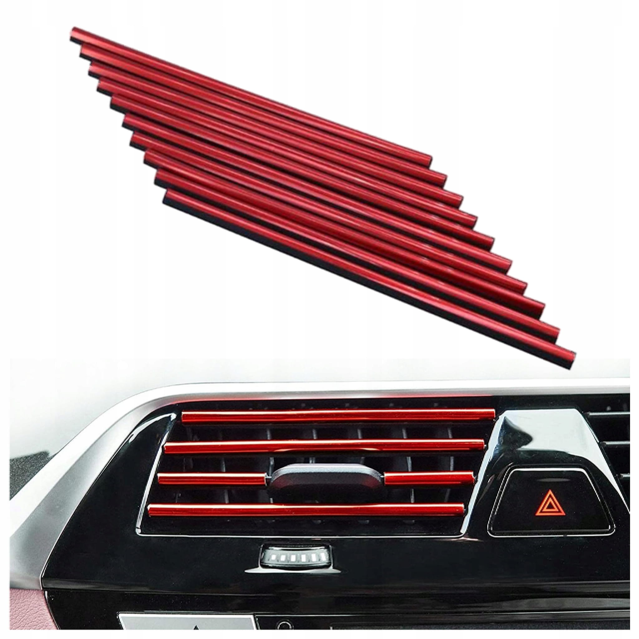 Odmień wnętrze swojego samochodu w kilka minut! Czerwone listwy dekoracyjne na kratki nawiewu to szybki i efektowny sposób na nadanie sportowego charakteru Twojemu wnętrzu. Wykonane z elastycznego materiału listwy wciskane są bezpośrednio w kratki wentylacyjne – bez kleju, bez narzędzi i bez ryzyka uszkodzenia.