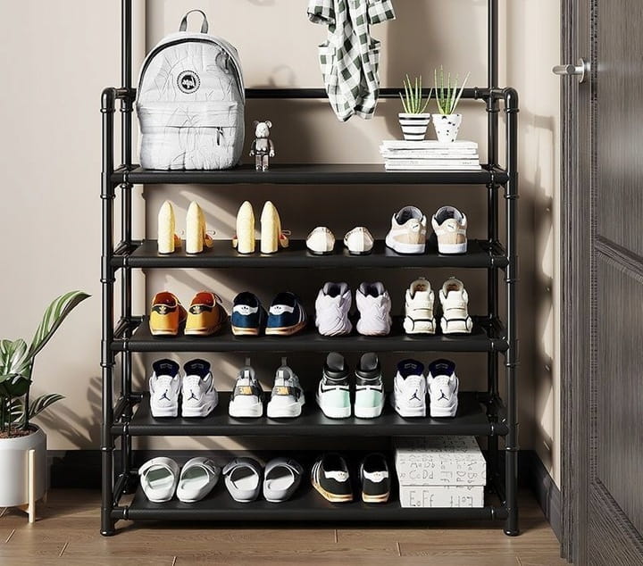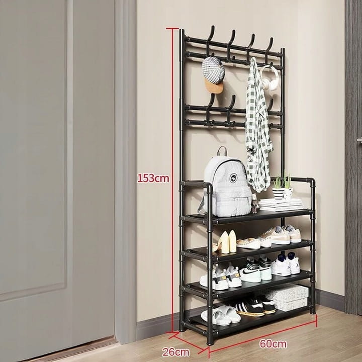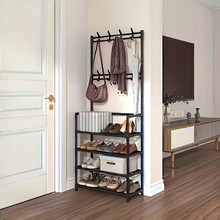 ✔️ Wielofunkcyjność – łączy w sobie funkcję wieszaka na ubrania oraz półek na buty i dodatki.