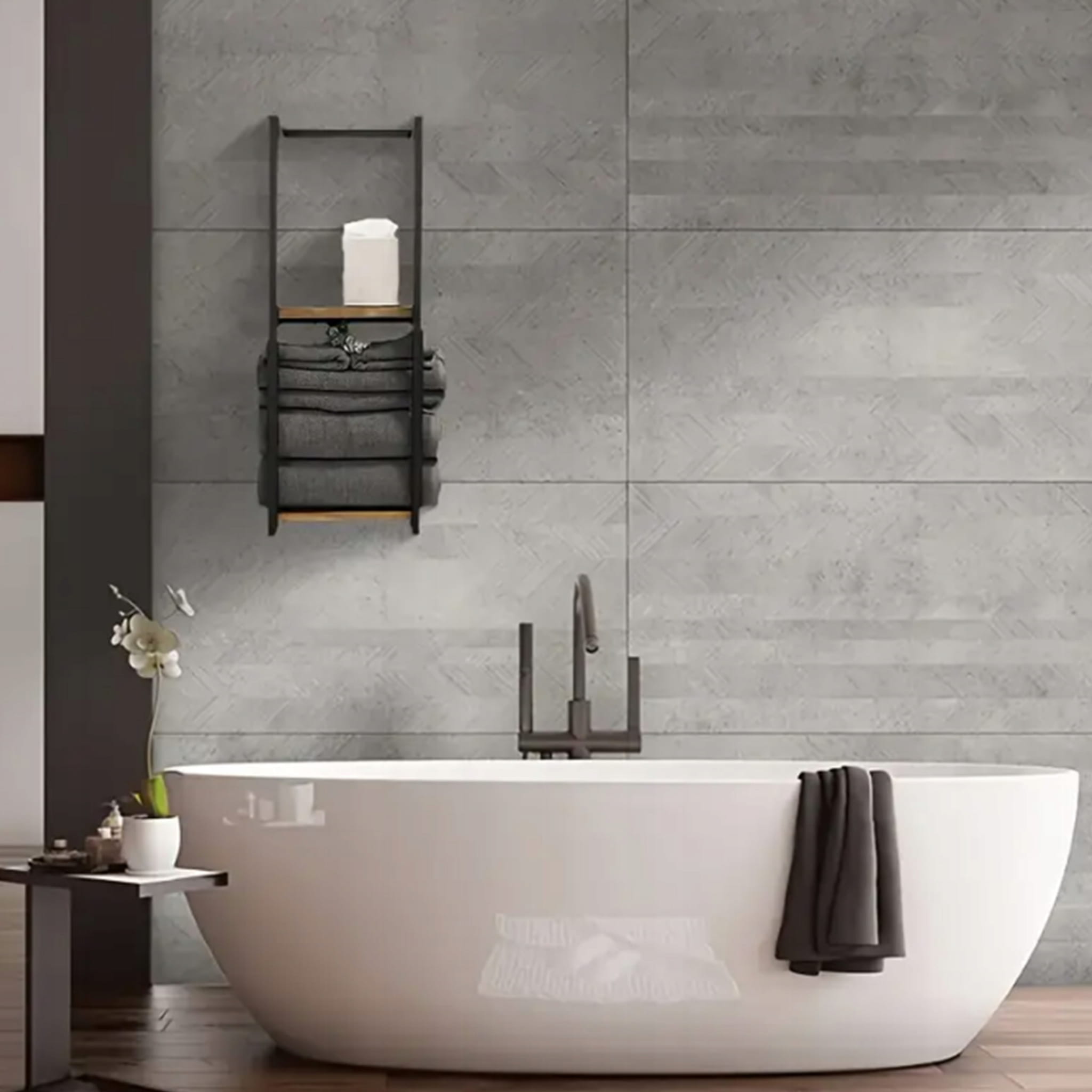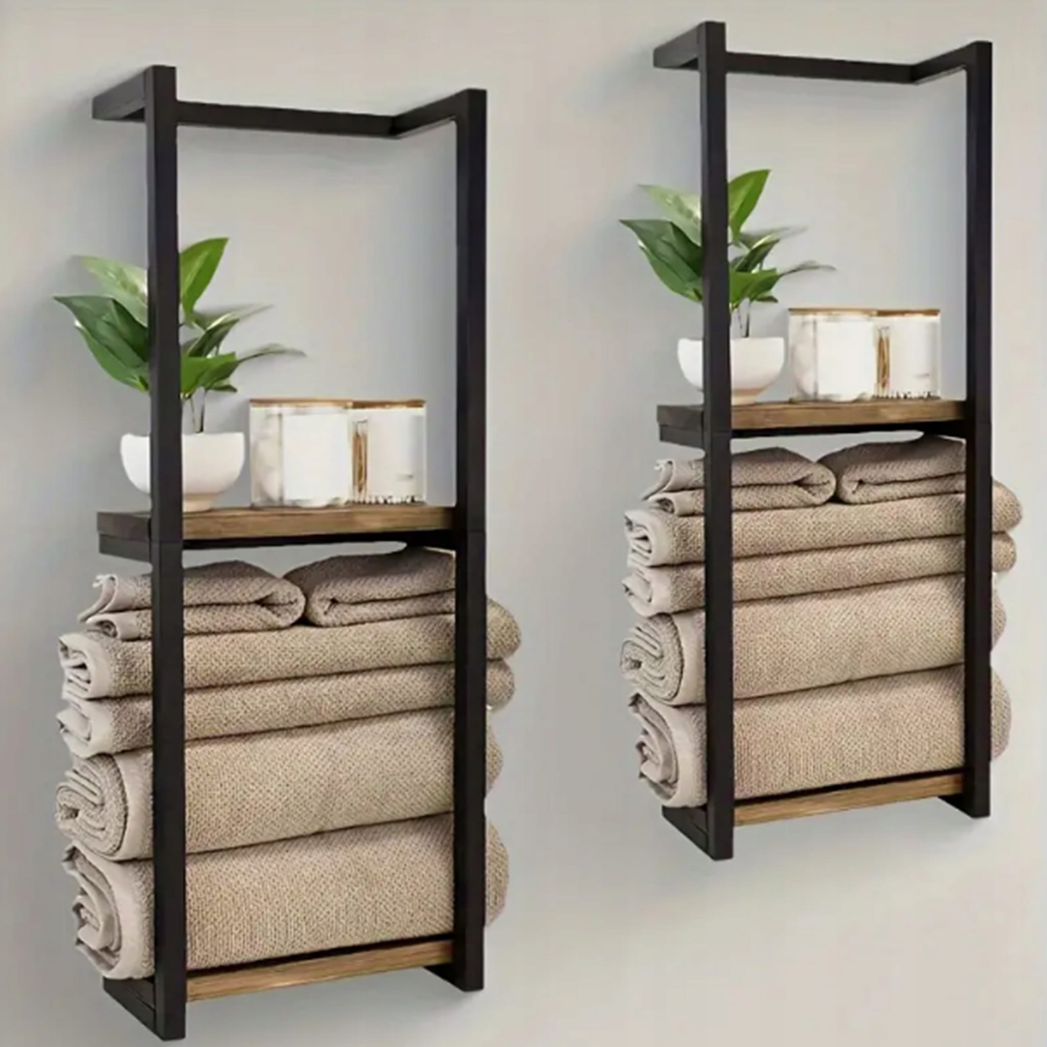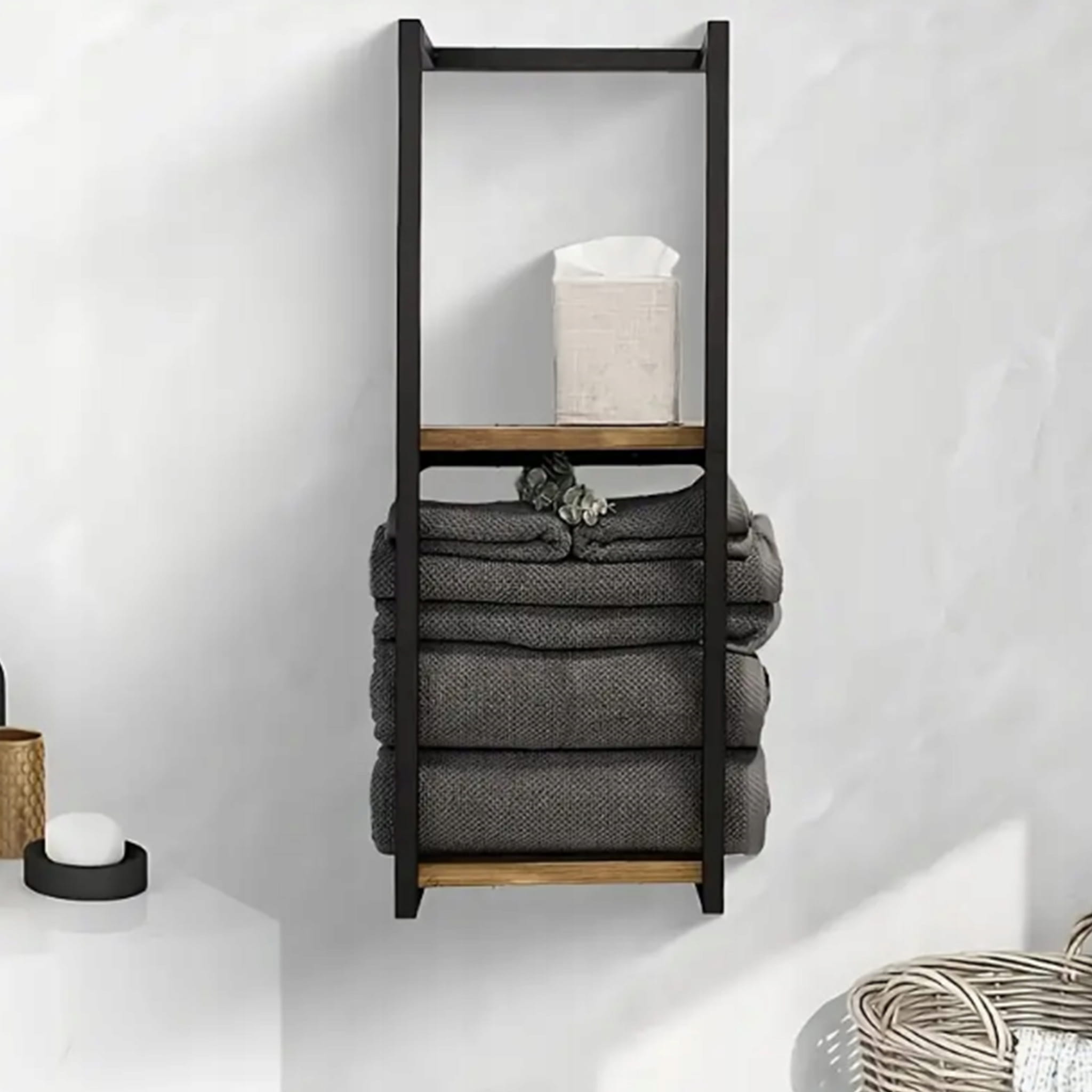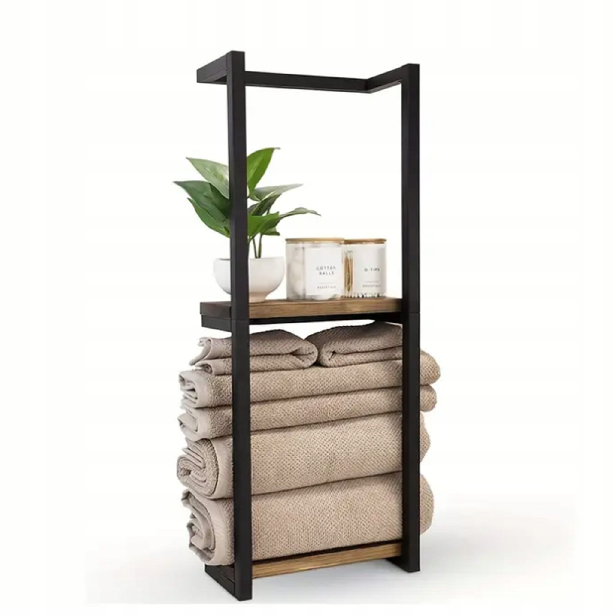 To nowoczesny, dwupoziomowy wieszak na ręczniki w stylu loftowym. Wykonany ze stali nierdzewnej w kolorze czarnym oraz drewnianych półek. Górna półka służy do przechowywania drobnych przedmiotów, takich jak rośliny doniczkowe, pojemniki na waciki czy kosmetyki. Dolna część umożliwia estetyczne układanie złożonych ręczników. Solidna konstrukcja i minimalistyczny design sprawiają, że idealnie pasuje do nowoczesnych łazienek.