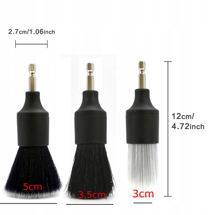 Profesjonalny zestaw szczotek detailingowych do wkrętarki – idealny wybór dla każdego fana czystego i zadbanego auta! W skład zestawu wchodzą trzy szczotki o różnej twardości i długości włosia, dzięki czemu z łatwością doczyścisz nawet najbardziej niedostępne zakamarki wnętrza auta, felg, nawiewów, emblematów i listew. Końcówka z mocowaniem na wkrętarkę (bit 1/4") sprawia, że praca jest szybka, skuteczna i bez wysiłku. Wysokiej jakości włosie nie rysuje powierzchni, a wyprofilowany uchwyt zapewnia wygodę użytkowania.